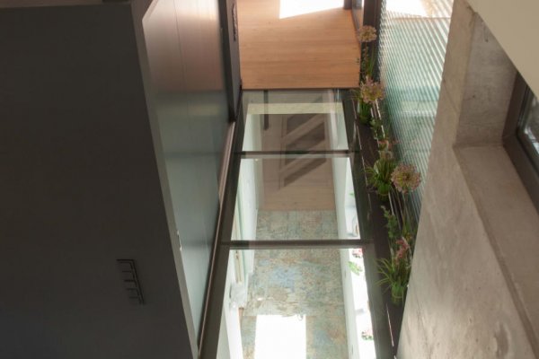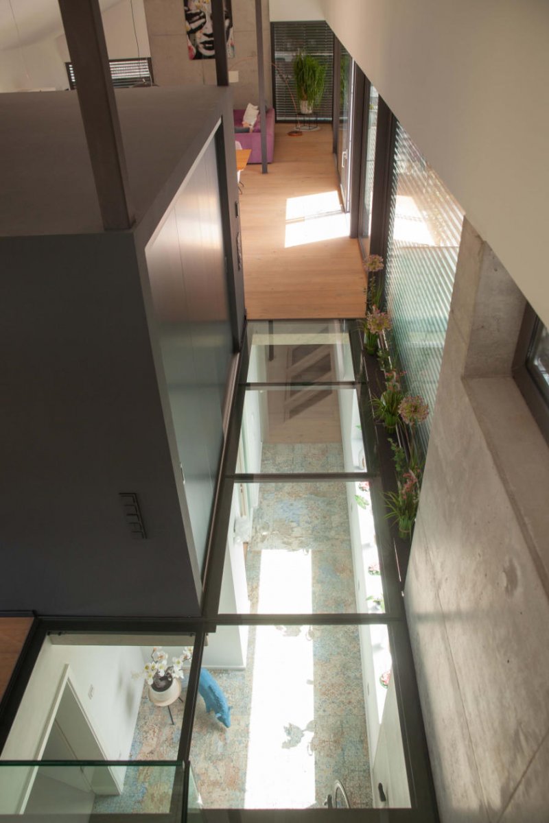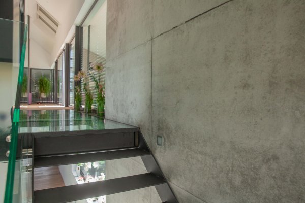 Das Gebäudeinnere erscheint durch die überhohe Raumgestaltung fast loftartig. Ein besonderes Highlight sind die großflächigen, durchsichtigen Glasböden zwischen den Stockwerken, die das Haus sehr transparent wirken lassen und das Untergeschoß zusätzlich mit Licht versorgen.