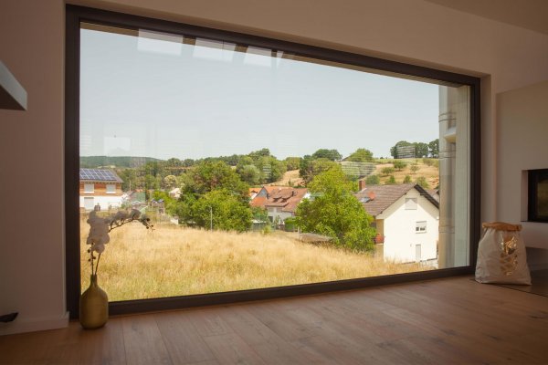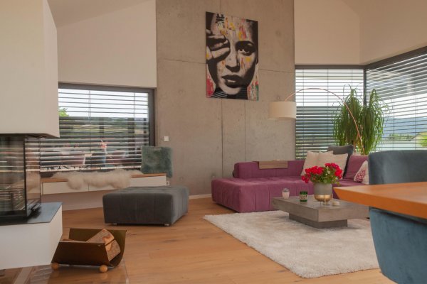 Feine Sichtbetonflächen und ein Boden aus Echtholzdielen im Wohnbereich sorgen für einen modernen aber warmen Eindruck. Das große Panoramafenster Richtung Norden gewährt einen unverstellten Blick auf die umliegende Natur.