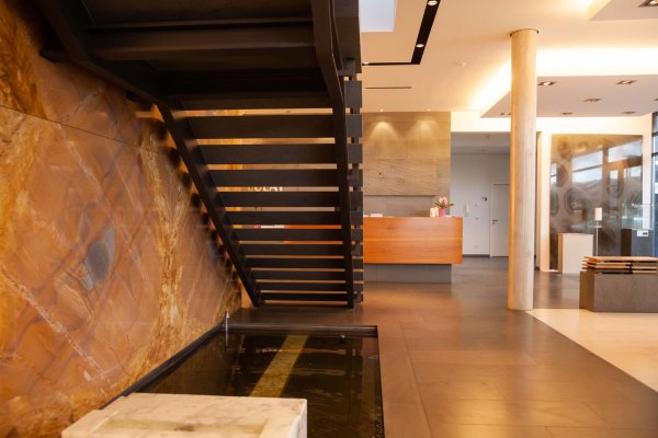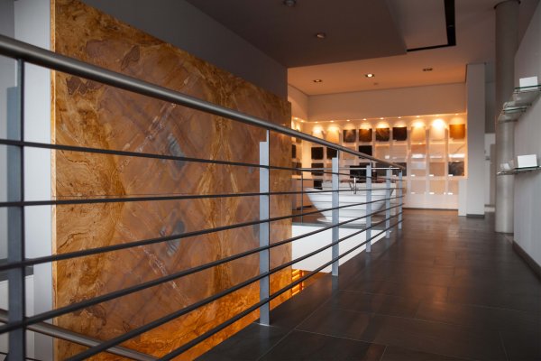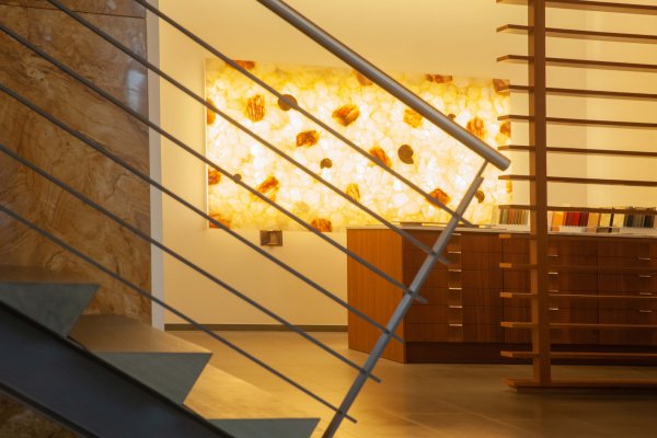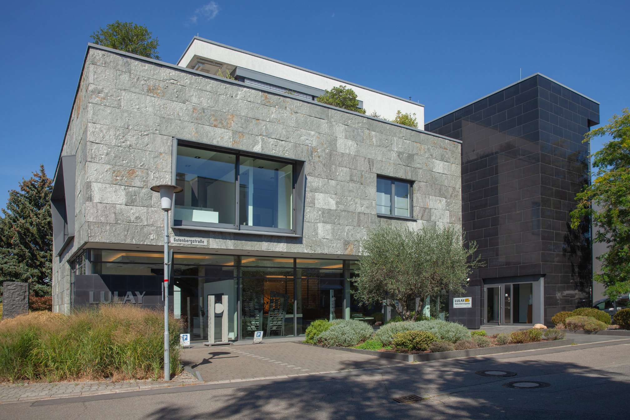 Der Lulay'sche Showroom ist ständige Ausstellung und Museum des Natursteins. Großzügige Ausstellungsräume zeigen die Bandbreite und Ausdruckskraft von Naturstein, kombiniert mit hochwertigen Elementen aus gebeiztem Edelholz und pulverbeschichteten Metalloberflächen.