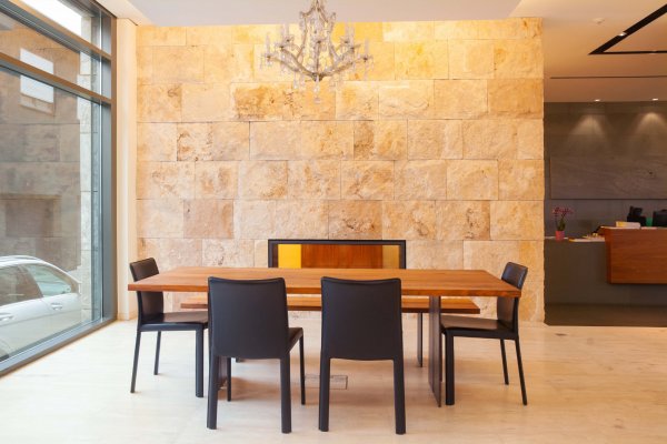 Im Erdgeschoss und der ersten Etage befinden sich Showroom und Konferenzräume mit großflächigen Naturstein-Dekors. Die zweite Etage enthält eine Dachterasse mit zurückgesetzter Penthouse-Wohnung, erreichbar über einen separaten Treppenaufgang.