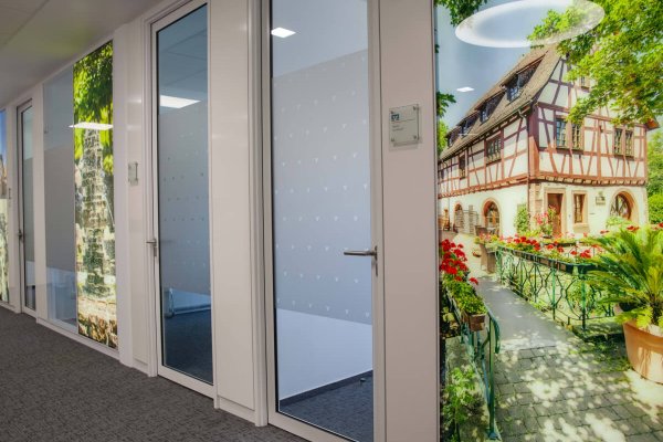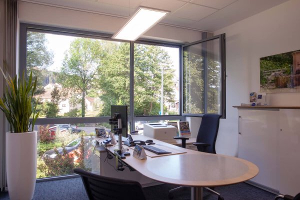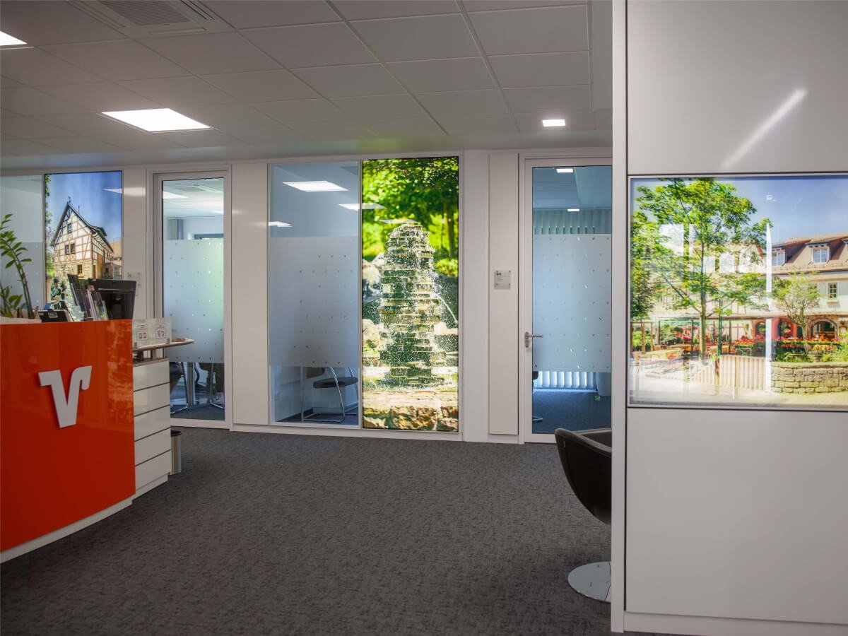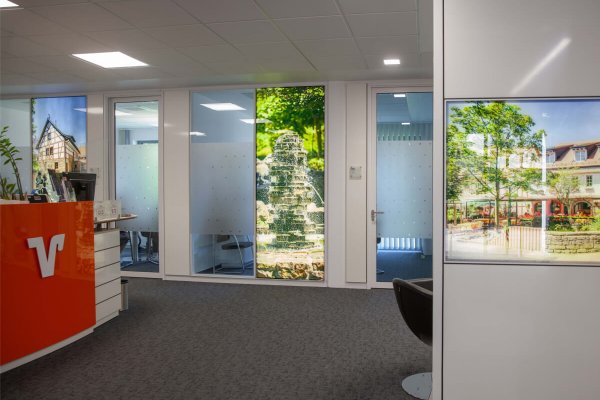 Durch die Verbindung von traditionellem Fachwerk mit funktioneller Bankarchitektur entsteht ein spannender Kontrast. Dieser wird auch im Gebäude weitergeführt, durch die großformatigen Lichtpanele mit Aquarell-Motiven aus der Region.