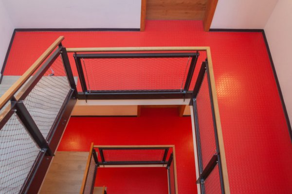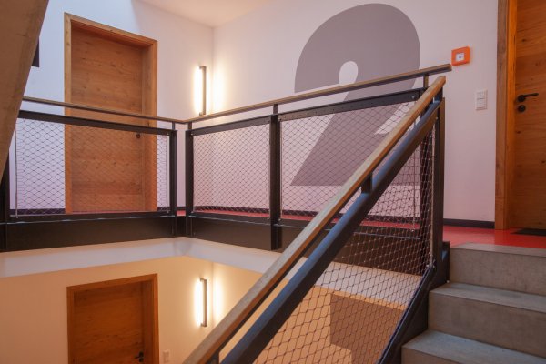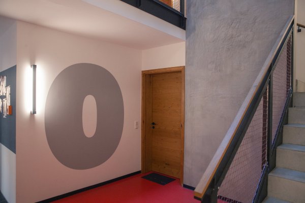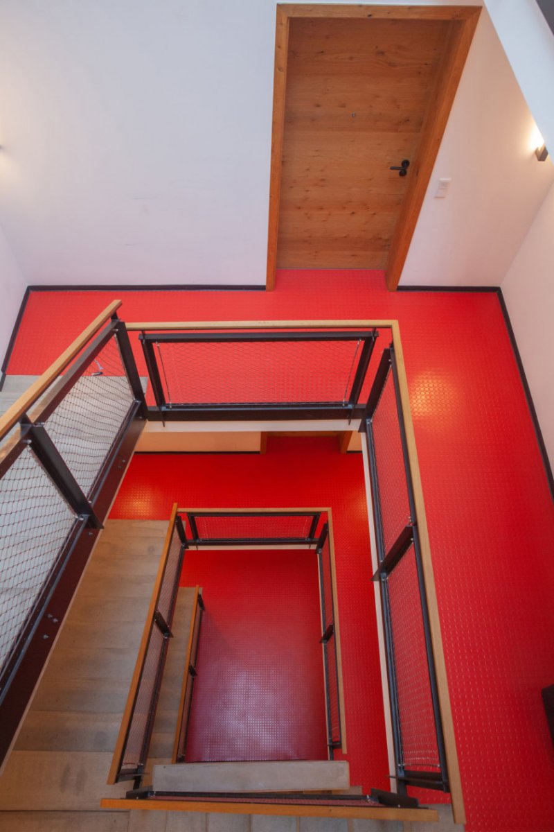 Von Aussen integriert sich das Gebäude sehr gut in den umgebenden Bestand. Die graue Fassade wirkt durch die großen Fenster und die asymmetrischen weißen Umrandungen lebendig und offen. Die Farben schwarz, weiß und rot in Kombination mit Eichenholz ziehen sich durch die gesamte Innenraumarchitektur und kommen besonders im Treppenhaus zur Geltung.