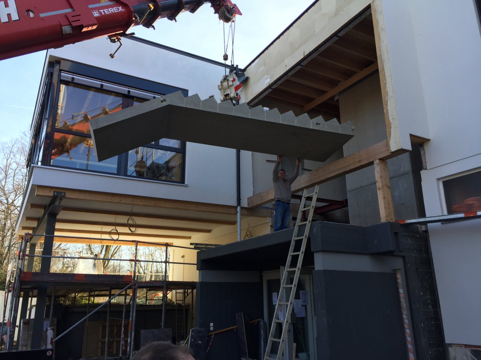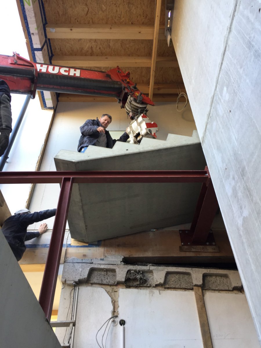 Die Montage der neuen Elemente durch eine enge Öffnung via Kran ins Innere eines Bestandgebäudes war eine komplexe Operation, die wohl am ehesten mit der Konstruktion eines Buddelschiffs vergleichbar ist. Die Lösung der Aufgabe mit Fertigteilen war ein Sondervorschlag, der erhebliche Vorausplanungen nötig gemacht hat.