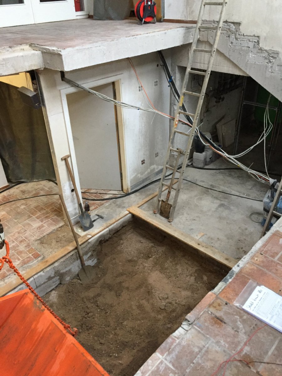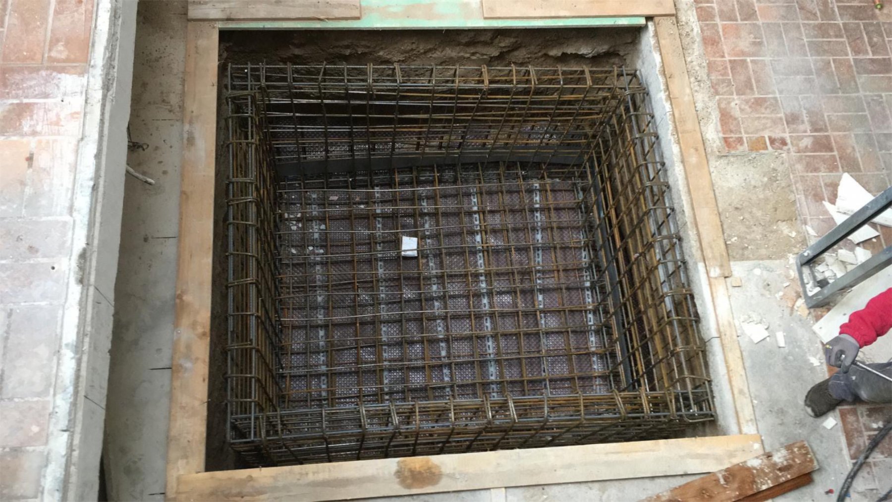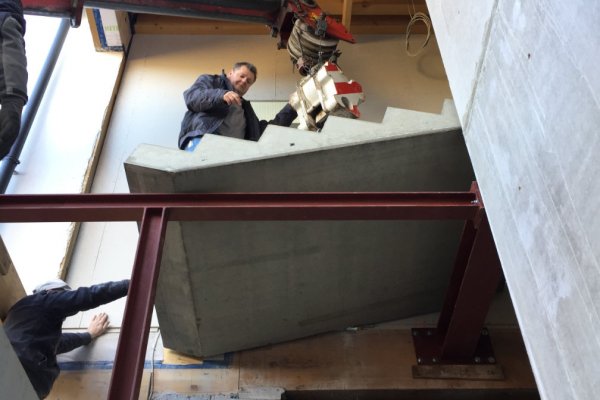 Zunächst wurden die alten, sehr breiten Treppen herausgeschnitten und ein Rückbau der Stahlbetondecke vorgenommen. Über temporäre Öffnungen in der Fassade und im Dach wurden die vorgefertigten neuen Treppen und der neue Aufzug per Kran ins Gebäude gehievt und millimetergenau positioniert.