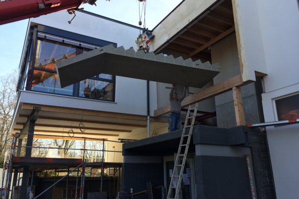 Einbau von oberflächenfertigem Treppenhaus und Aufzug in ein bestehendes Gebäude, Montage duch Öffungen in Fassade und Dach, Rückbau von Stahlbetondecke und Heraustrennen vorhandener Treppenläufe