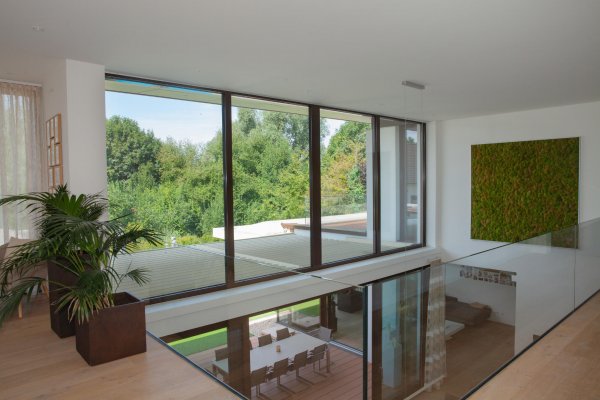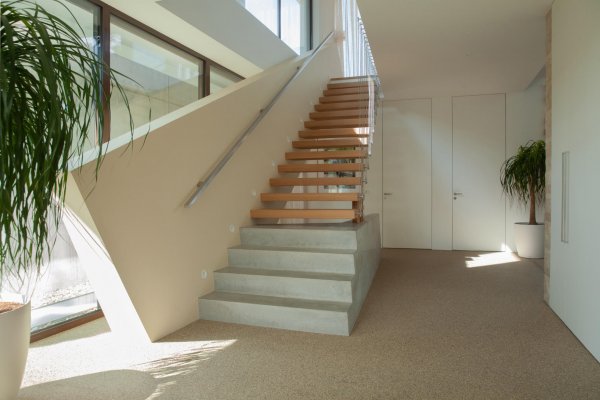 Die hohen Räumen und die Glasfassade zum Garten schaffen eine luftige Atmosphäre. Eine freischwebende Kragstufentreppe ohne Stützkonstruktion bildet einen besonderen Akzent im hochwertigen Innenausbau. Die großzügige Terrasse mit Pool und herrlichem Blick ins Grüne lädt zum Verweilen ein.