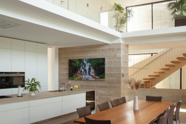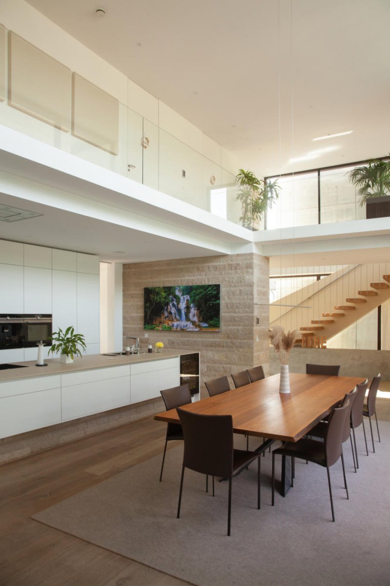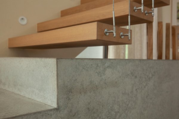 Schwebende Dächer und Brüstungsbänder betonen die horizontale Ausdehnung der Villa. In Kombination mit dem zurückgesetzten Untergeschoß wirkt das Gebäude so gleichzeitig massiv und doch leicht. Der edle Materialmix aus Holz, Kalkstein, Terraway & Sichtbeton, gepaart mit dunklen Fensterrahmen aus Aluminium sorgt für eine stilvoll-zurückhaltende Anmutung.